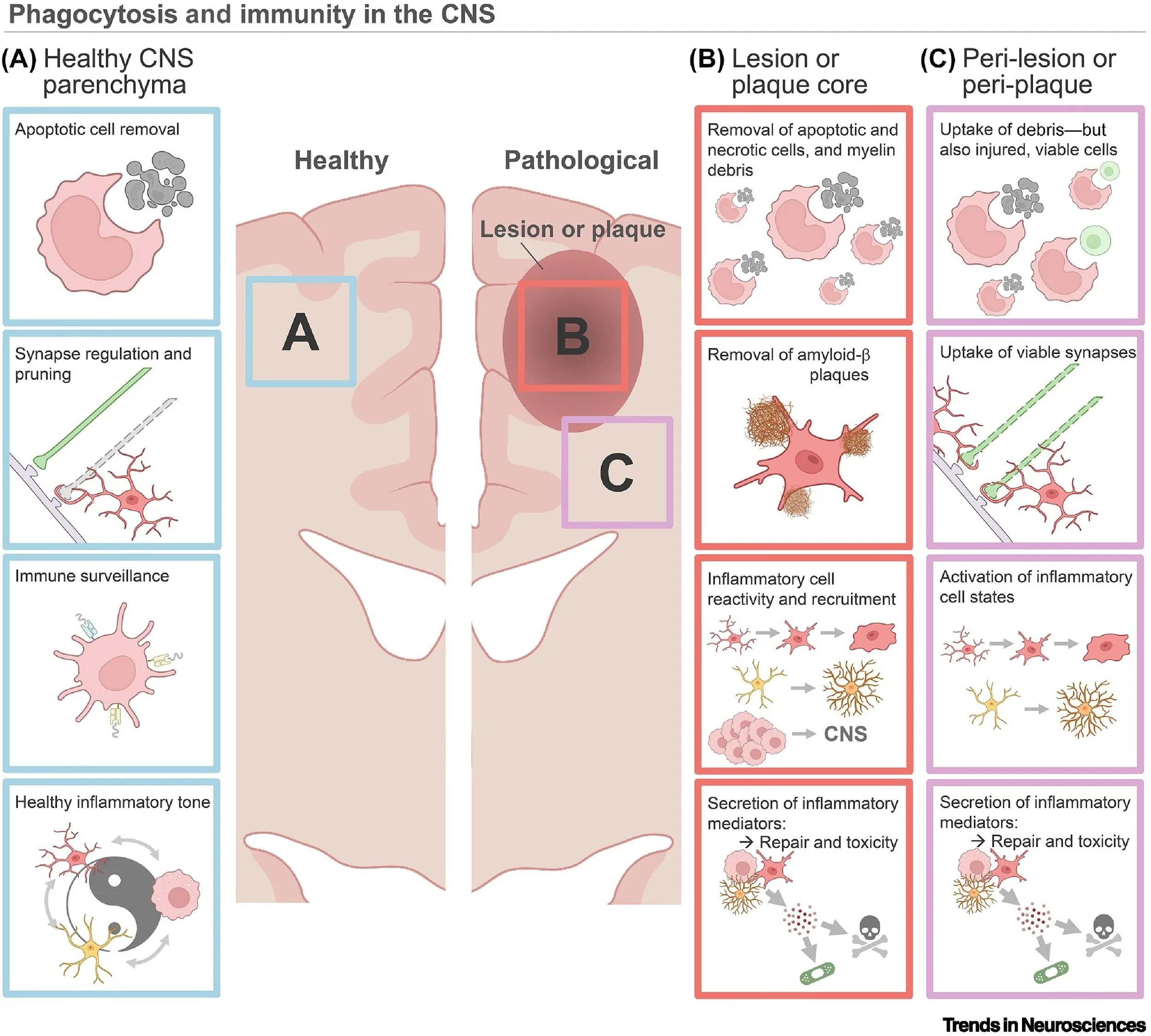 Disease and injury: The role of receptors like TREM2 and TAM receptors in clearing myelin debris in MS, amyloid-β in Alzheimer’s, and necrotic tissue after CNS injury and stroke.